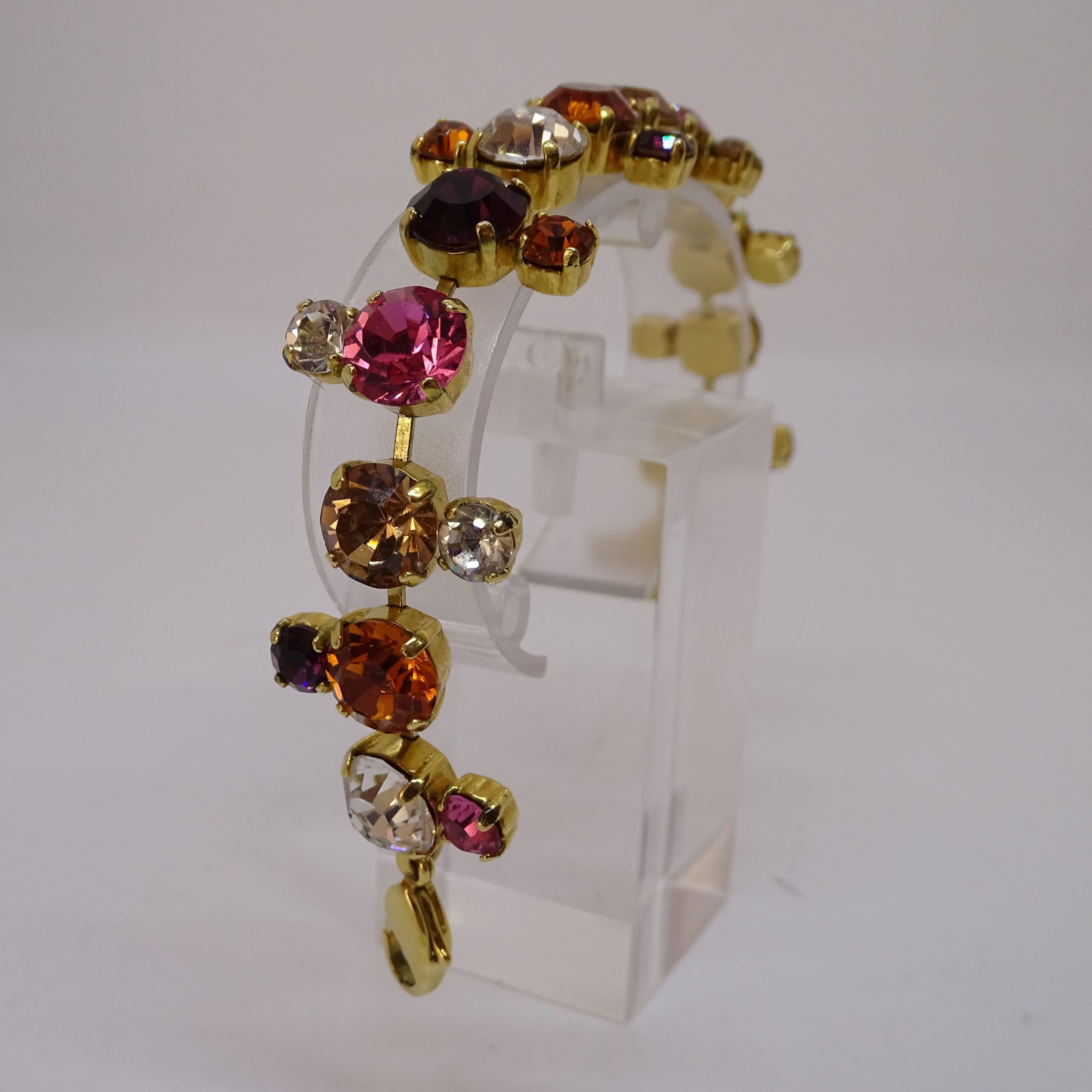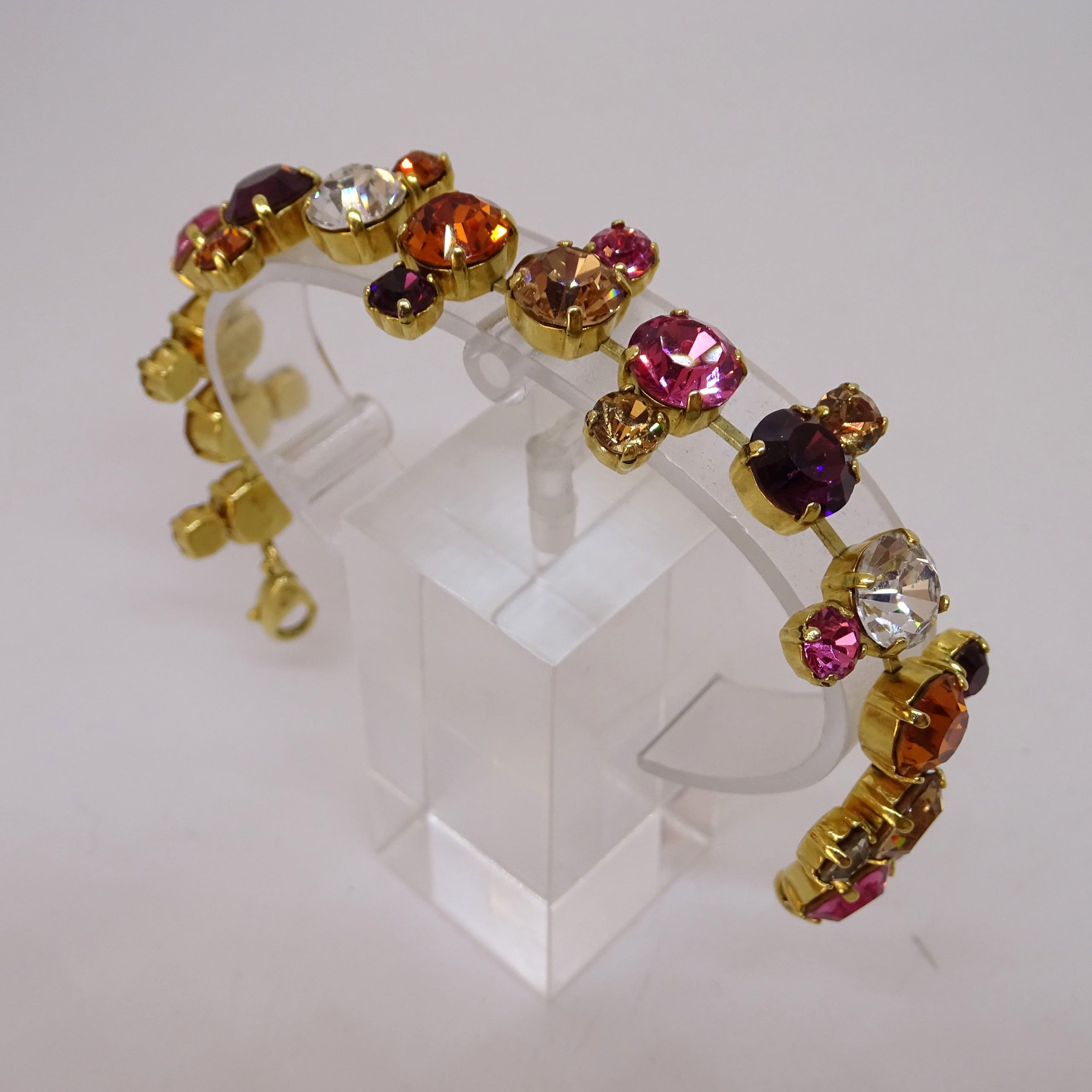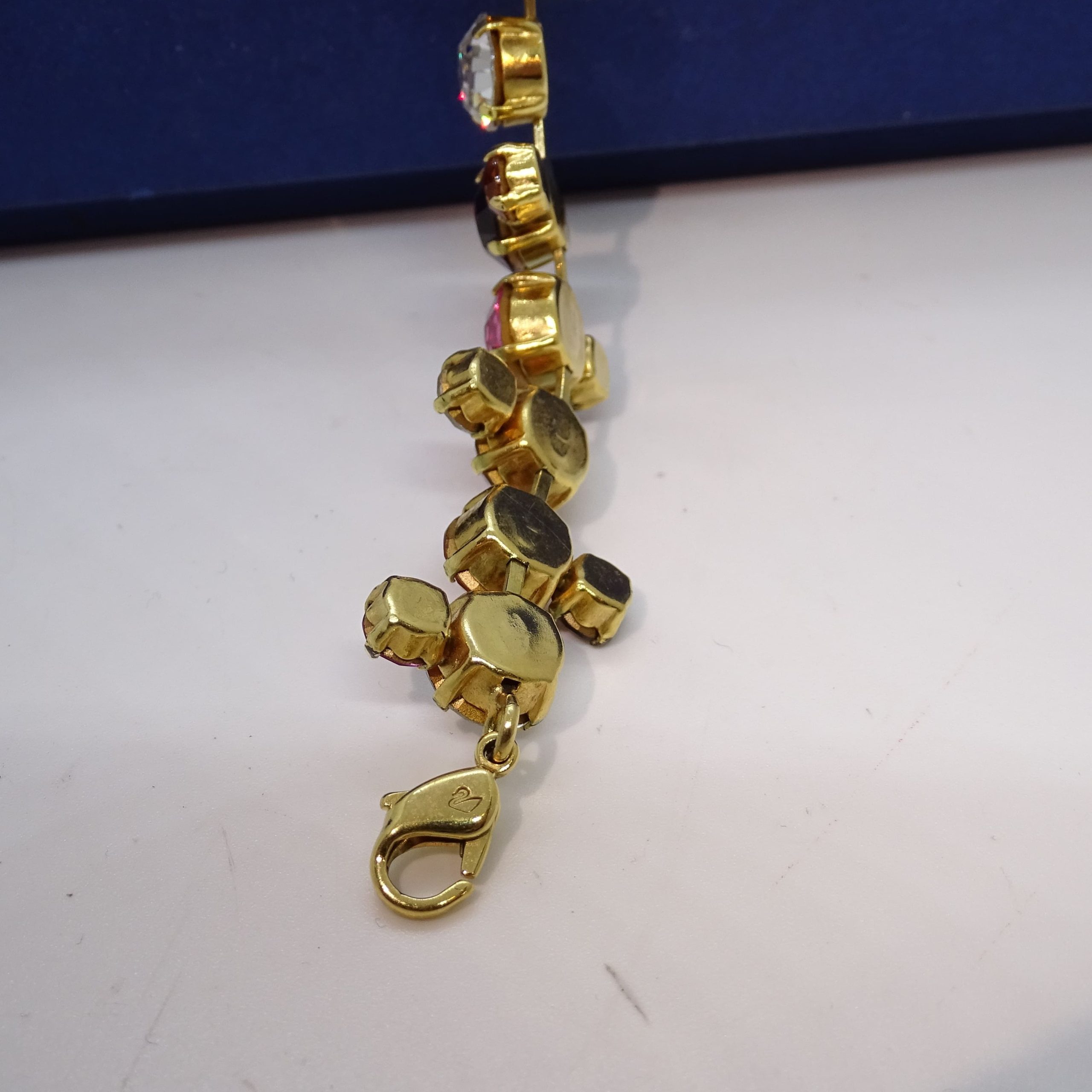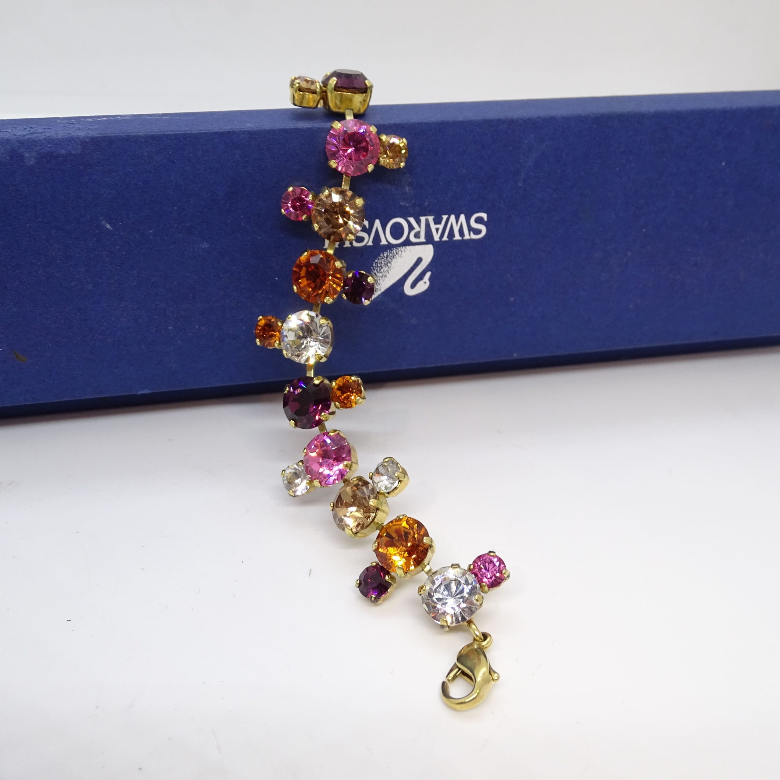 Divertida y original pulsera articulada de cristales Swarovski de colores, montada sobre metal dorado. Se compone de una sucesión de cristales de talla redonda por colores, que recuerda a colecciones como “Rainbow”, “Color Crystal Mix” o la actual “Gema”. Logo del cisne grabado en el cierre. Se presenta en su caja original con certificado de autenticidad. Aporta un toque divertido y de color a cualquier look.