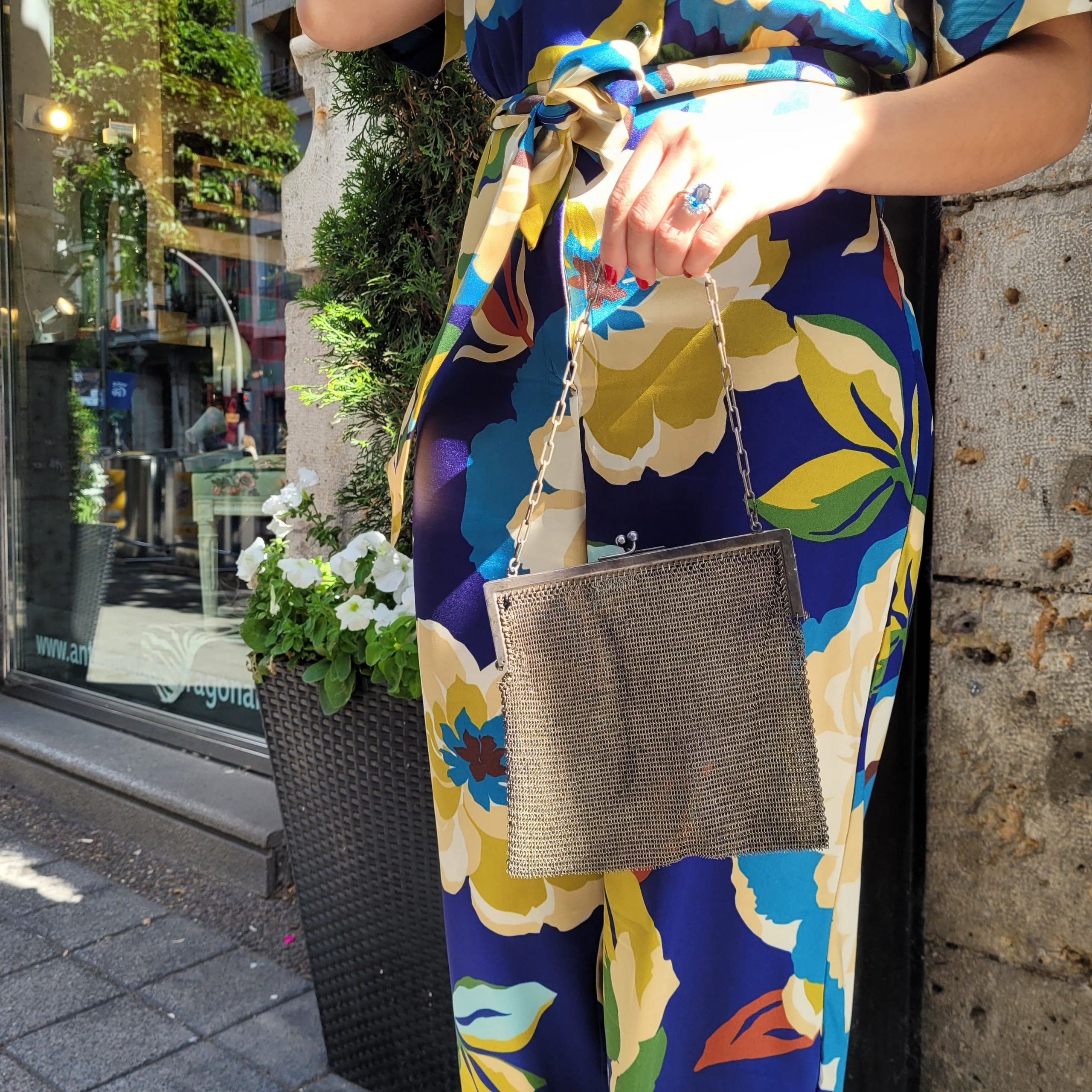 Bolso o faltriquera en silver plate, realizado durante la década de los años 20 en Francia. El cuerpo principal es de malla, enmarcado en la parte superior por una boquilla rectangular lisa. El cierre es de tipo beso, de bolas entrelazadas. La cadena es de eslabones grandes, pero sin perder la finura y la elegancia. Resulta ideal como complemento para una ocasión especial.