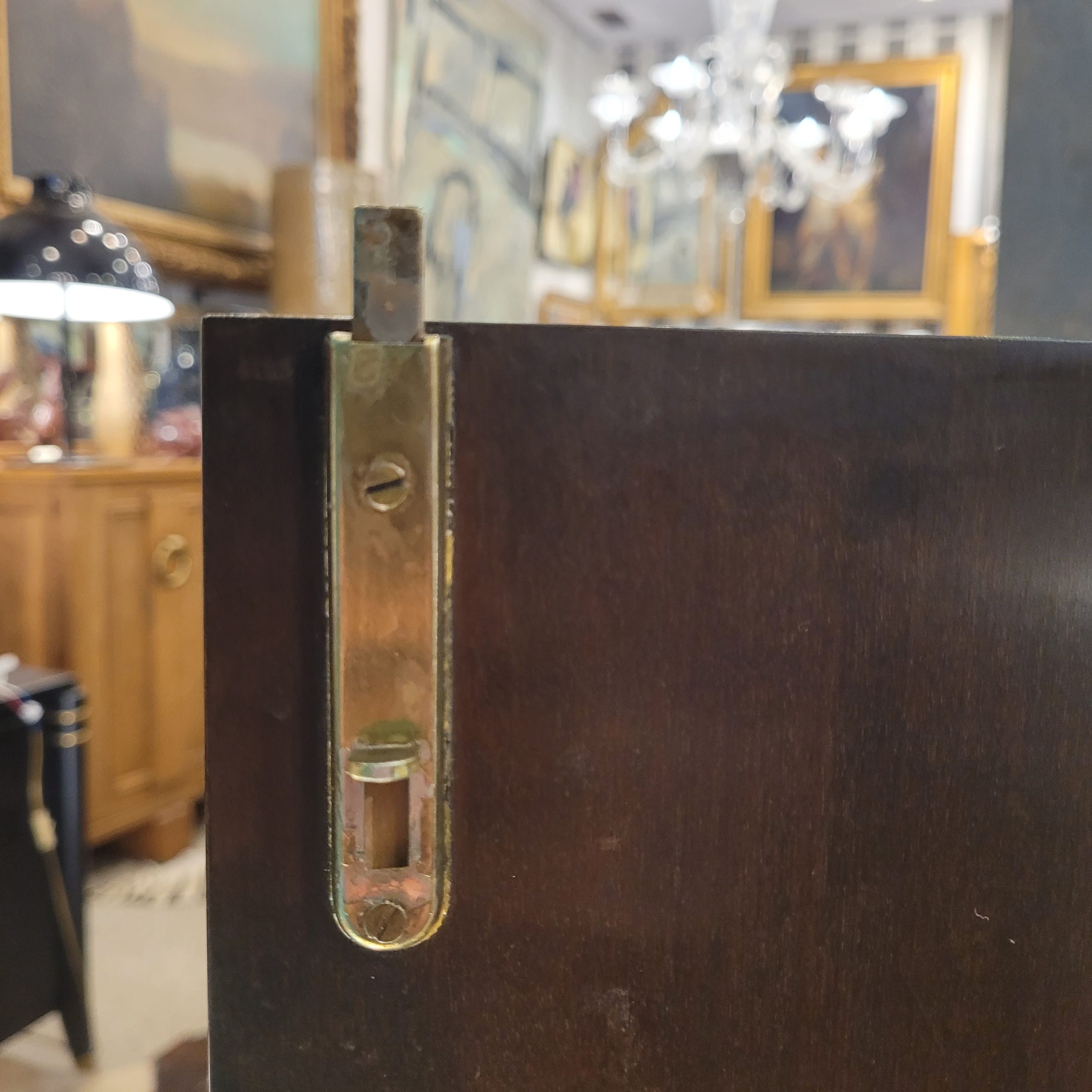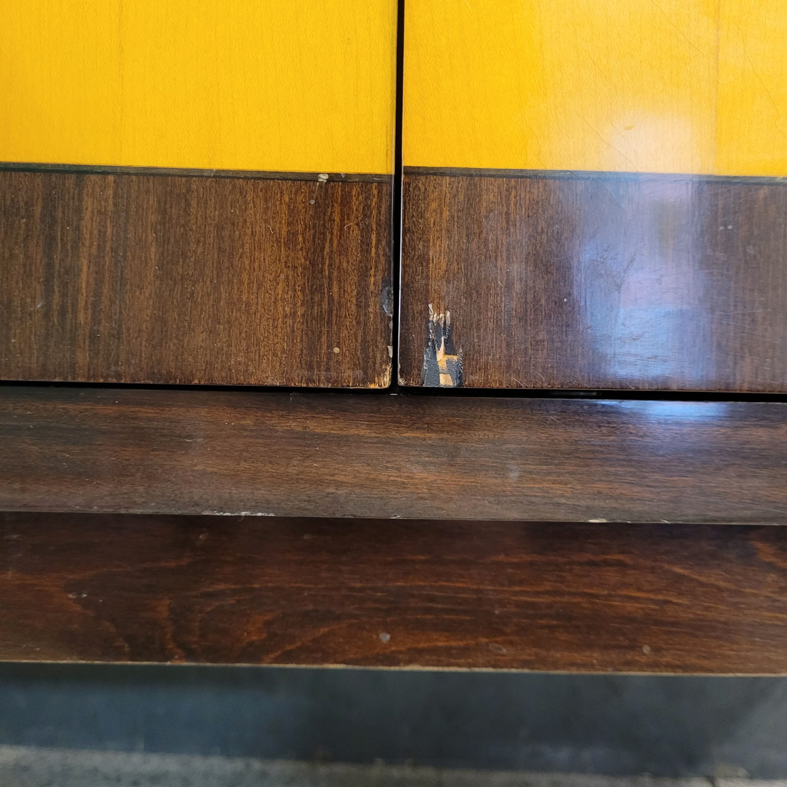 El palosanto contrasta armónicamente con el diseño geométrico que se encuentra en el frente, ocupando ambas puertas, con el tono particular de la madera de limoncillo. Esto crea un punto focal dinámico y simétrico, característico del lenguaje visual del Art Déco. Las puertas se abren mediante un mecanismo magnético oculto que evita los tiradores, dejando la superficie lisa y brillante. Está, además, perfectamente equipado en su interior, con una división vertical y dos baldas horizontales, un total de 6 celdas en las que disponer los distintos elementos, como botellas y copas, aunque se trata de un mueble versátil al que se le puede dar uso de armario o aparador.