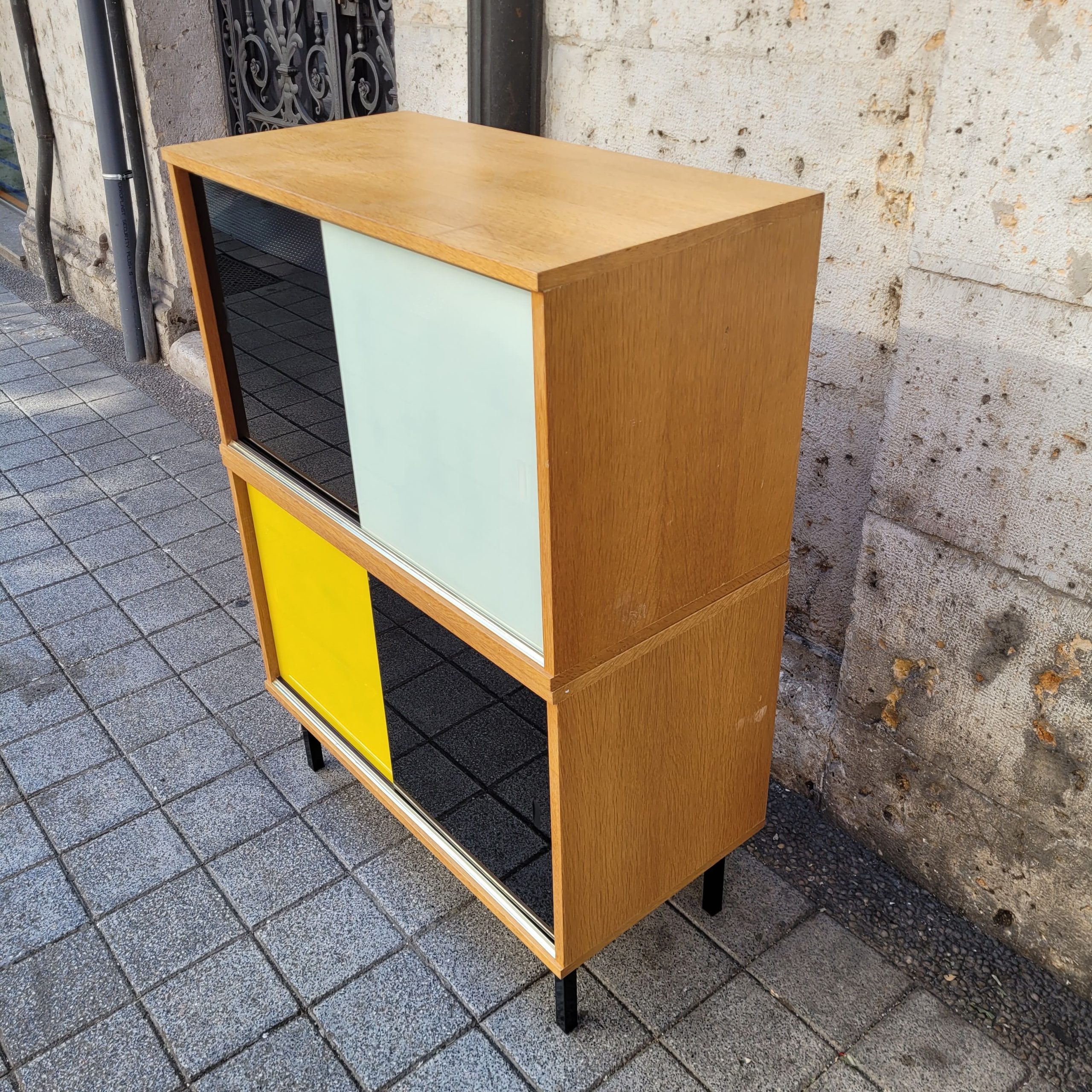 Espectacular mueble modular, diseño del francés Didier Rozaffy, años 60. Se trata de dos piezas diferenciadas, que pueden colocarse por separado o superpuestas. El diseño refleja la funcionalidad y la claridad visual del modernismo de esa década. Se caracteriza por su forma geométrica, de frente rectangular y lateral cuadrado. Se eleva sobre cuatro patas, de sección cuadrada, cortas y estrechas. Las puertas correderas de cristal están lacadas en negro, blanco y amarillo, lo que aporta un toque de color y dinamismo. En el interior de cada módulo una balda facilita el almacenamiento.