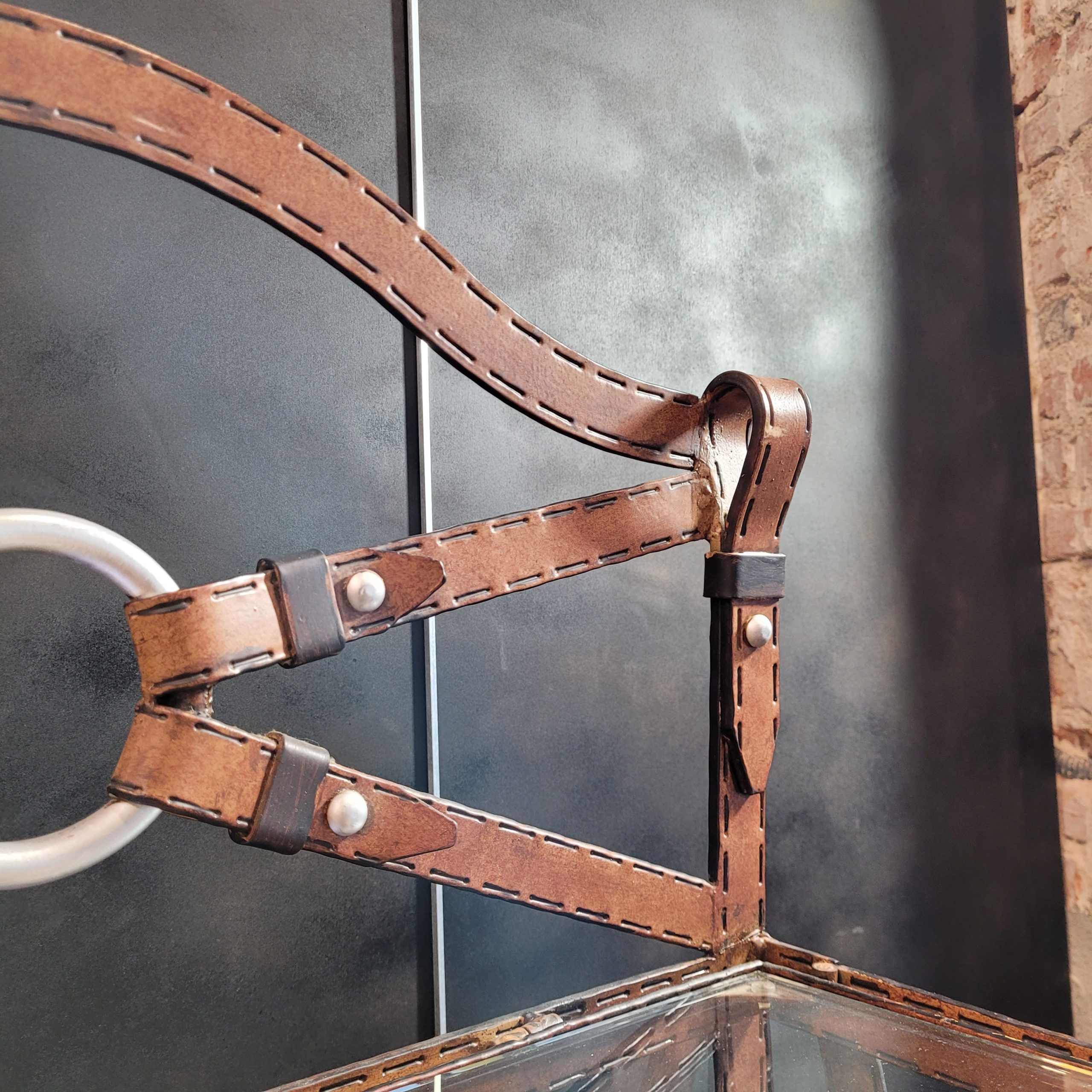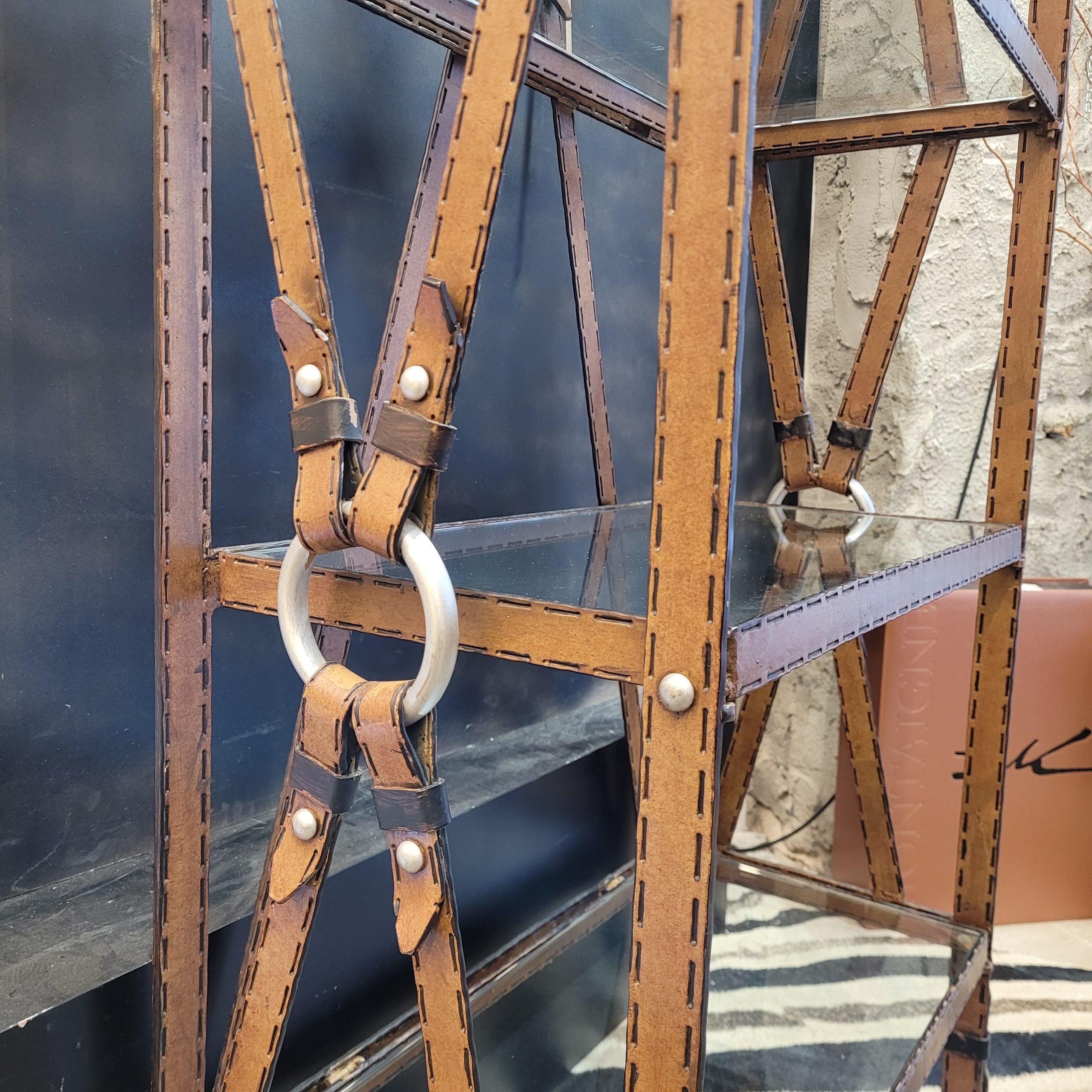 Espléndida estantería o librería de la década de 1970, en forja policromada y baldas de cristal, diseño del francés Jacques Adnet. Este artista fue ampliamente reconocido por sus diseños para la casa Hermès basados en arnés de piel siguiendo un estilo ecuestre de gran refinamiento. Esta gran estantería simula cuero de forma muy realista, gracias a la manera de trabajar la forja así como por su posterior policromía en color camel, simulando las puntadas del cuero, y con adornos en negro y plata de carácter ecuestre. Presenta cinco baldas de cristal, espacio perfecto sobre el que exponer libros o esculturas. Se exhibe como una pieza escultórica en sí misma.