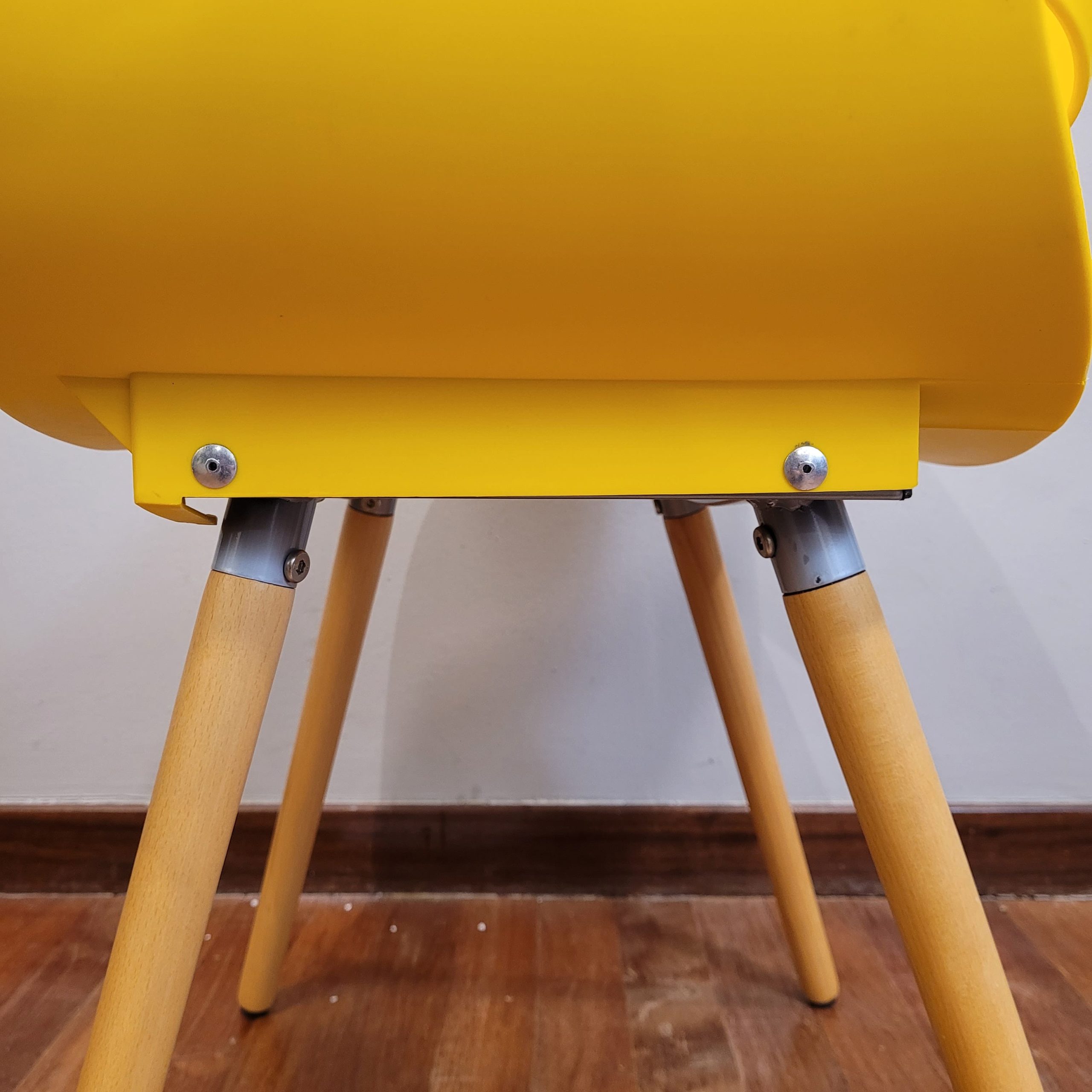 Divertida y original pareja de sillas de diseño contemporáneo, con asiento de PVC y patas de madera. El asiento se compone de una única pieza, que se curva para crear al mismo tiempo los reposabrazos y el respaldo de la silla. El color amarillo aporta el punto llamativo y alegre, que destacará en cualquier espacio o ambiente.