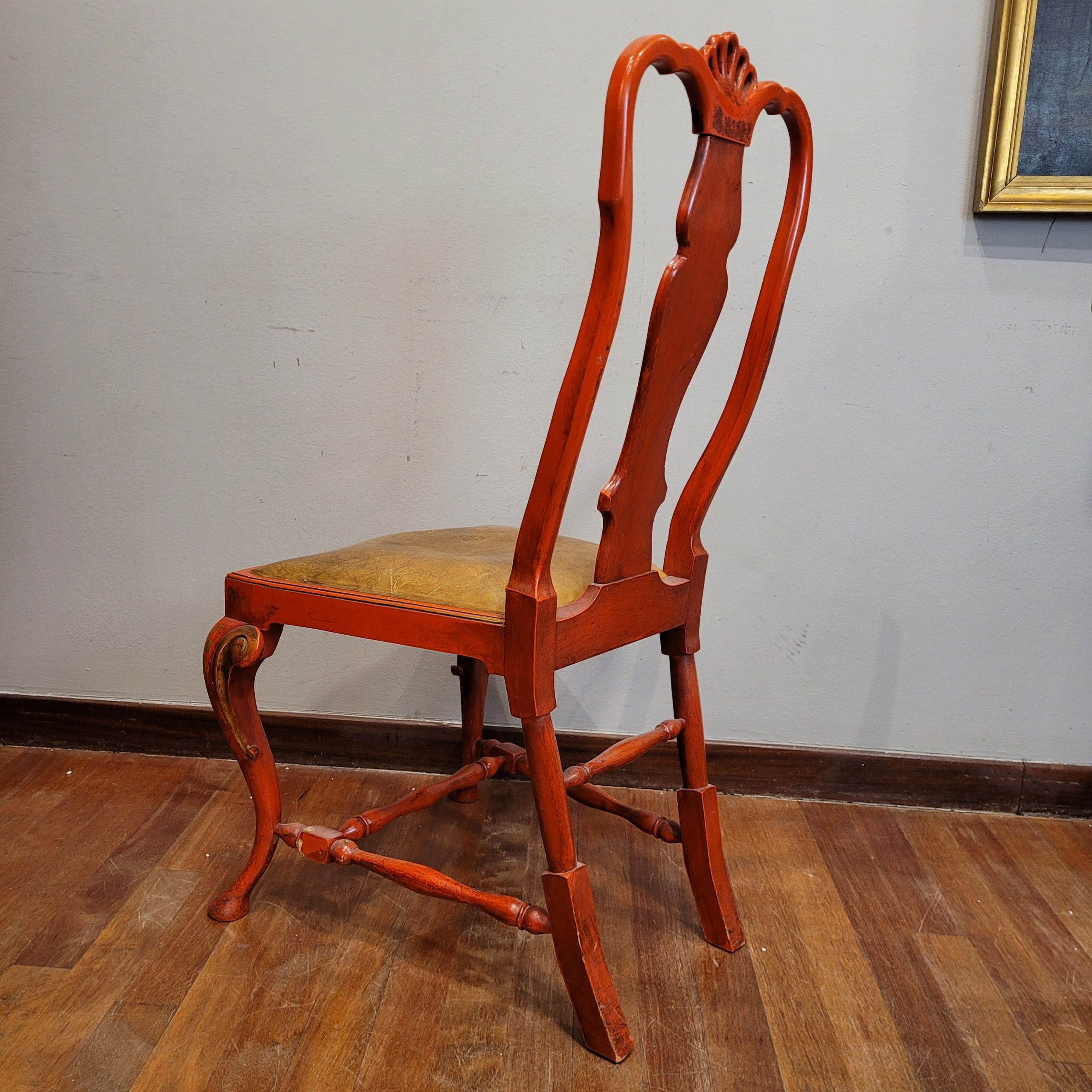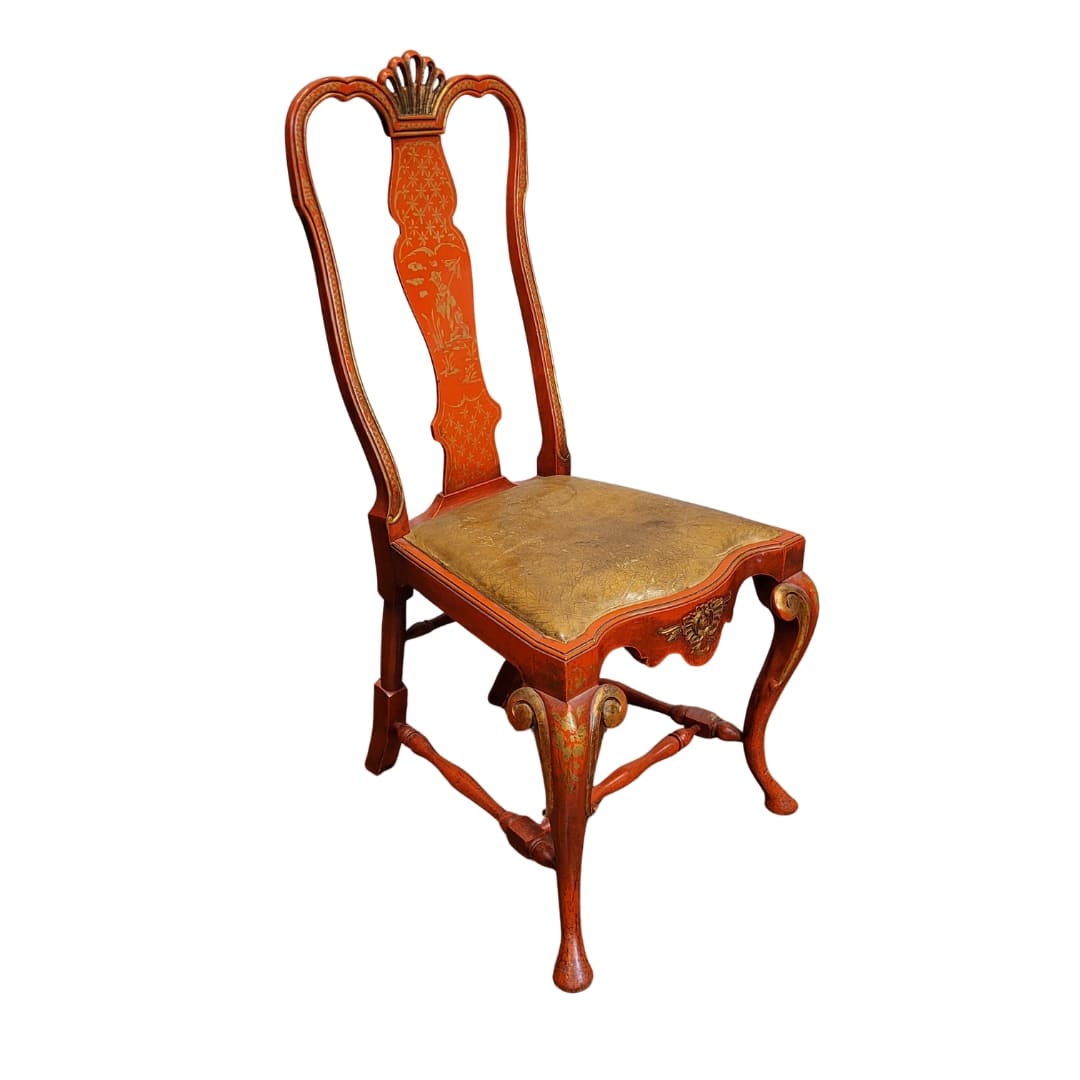 Su estructura es robusta, con las patas delanteras curvadas, conocidas como “patas cabriolé”. Sigue el estilo inglés Chippendale, estilo de mobiliario recibe el nombre de Thomas Chippendale (1718 – 1779), uno de los grandes ebanistas de origen inglés. En resumen, es una mezcla entre el rococó, el neoclásico y el barroco con ciertos matices de influencia oriental. Se trata de un estilo elegante, sofisticado y majestuoso. Se caracteriza por el protagonismo de la madera, especialmente las maderas nobles, que solían estar unidas al uso de textiles (cortinas, alfombras, tapizados…) de gran calidad y habitualmente estampados, donde los motivos y escenas orientales fueron primordiales. Las patas curvas son una de las señas de identidad. Una de ellas ha perdido la chambrana.