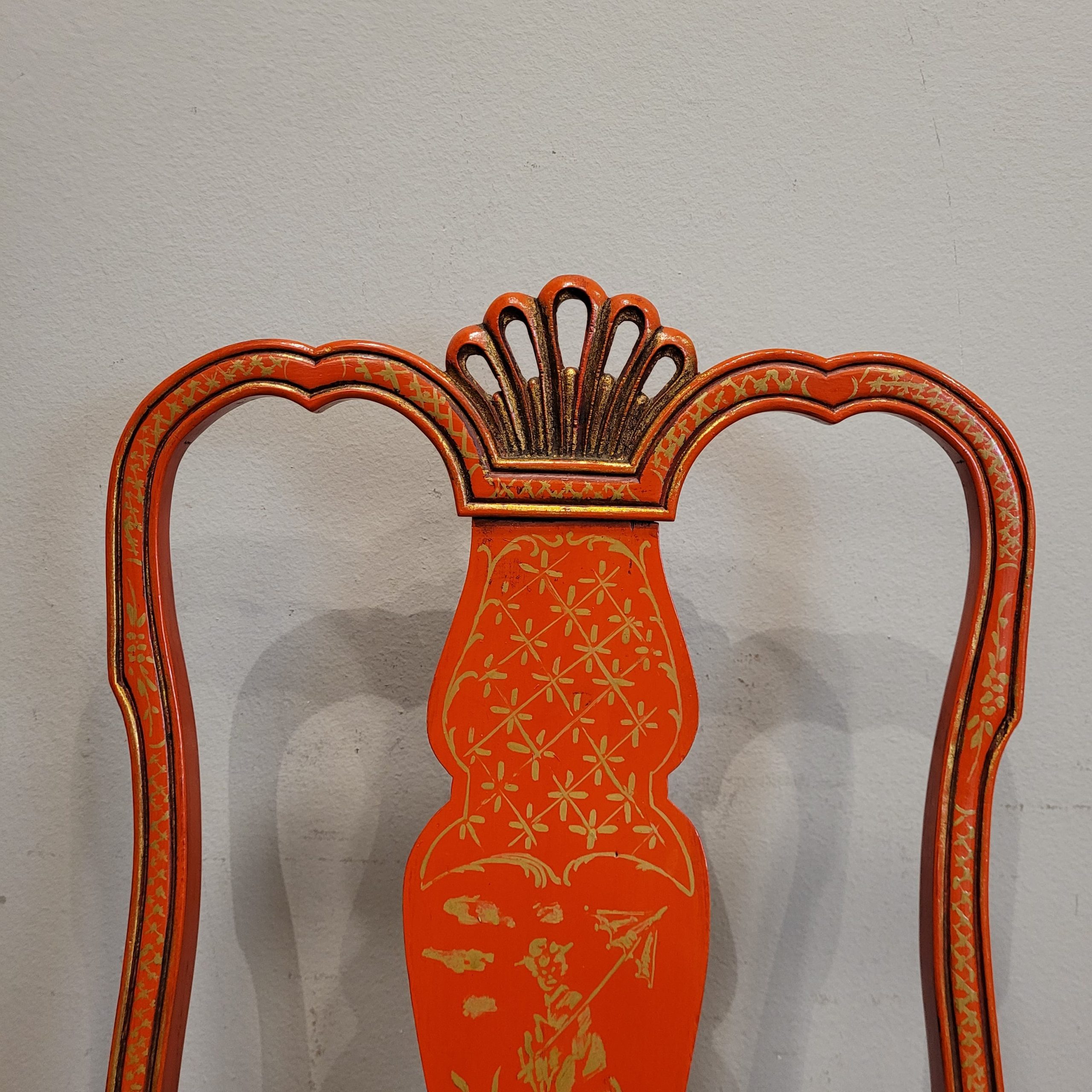 Excepcional pareja de sillas de estructura estilo Chippendale, en madera lacada en rojo al gusto andaluz, siguiendo el estilo del prestigioso diseñador francés Pierre Lottier, hacia la década de 1970. Decoraciones orientalizantes con chinoiseries en dorado.