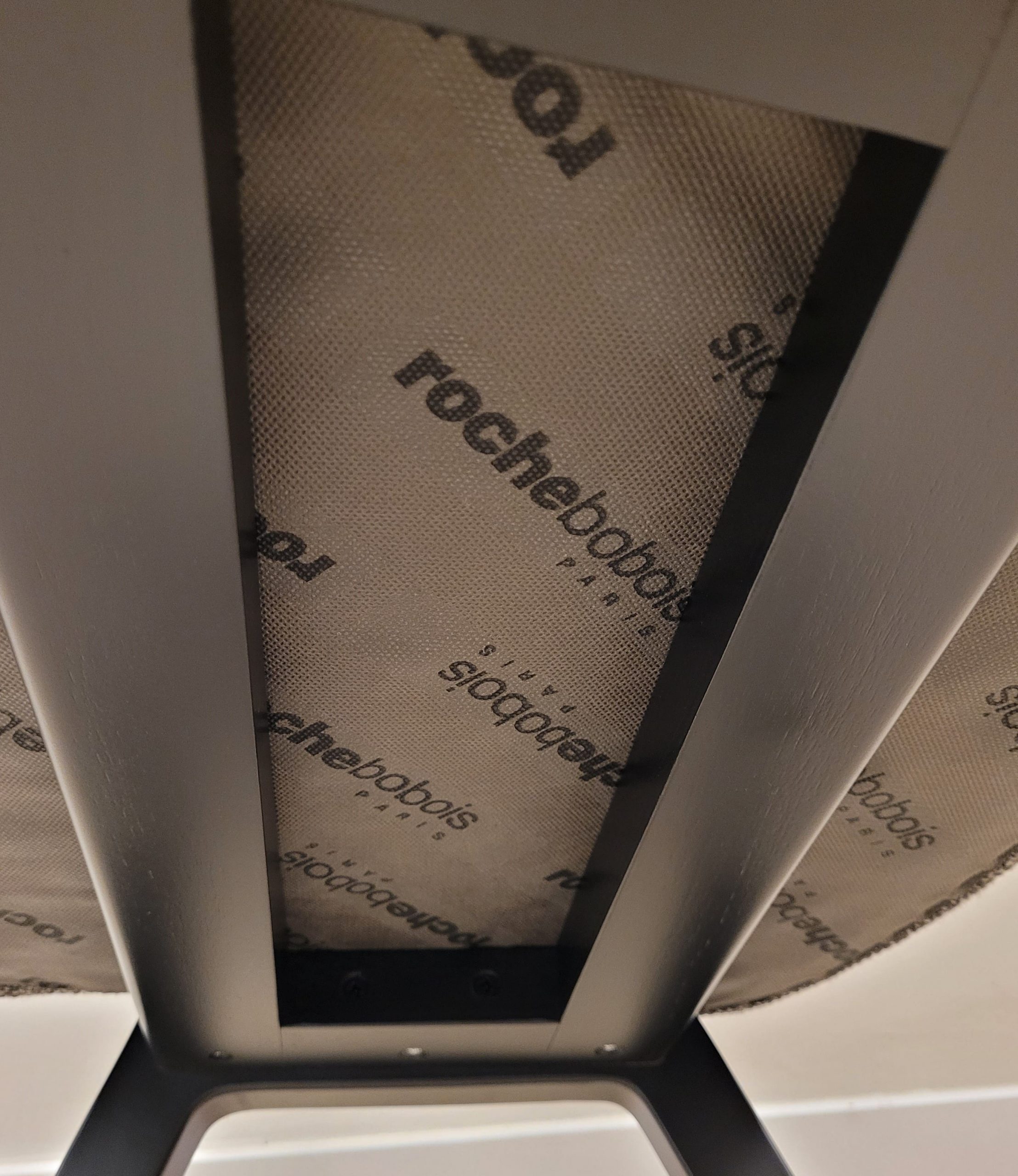 «Los diseñadores Roberto Tapinassi y Maurizio Manzoni han imaginado los contornos de este confortable bridge. Han jugado sobre las diagonales de las patas, haciéndolas remontar como para iniciar los apoyabrazos. En la parte trasera, el respaldo parece suspendido, acentuando aún más su confort.» – Roche Bobois.