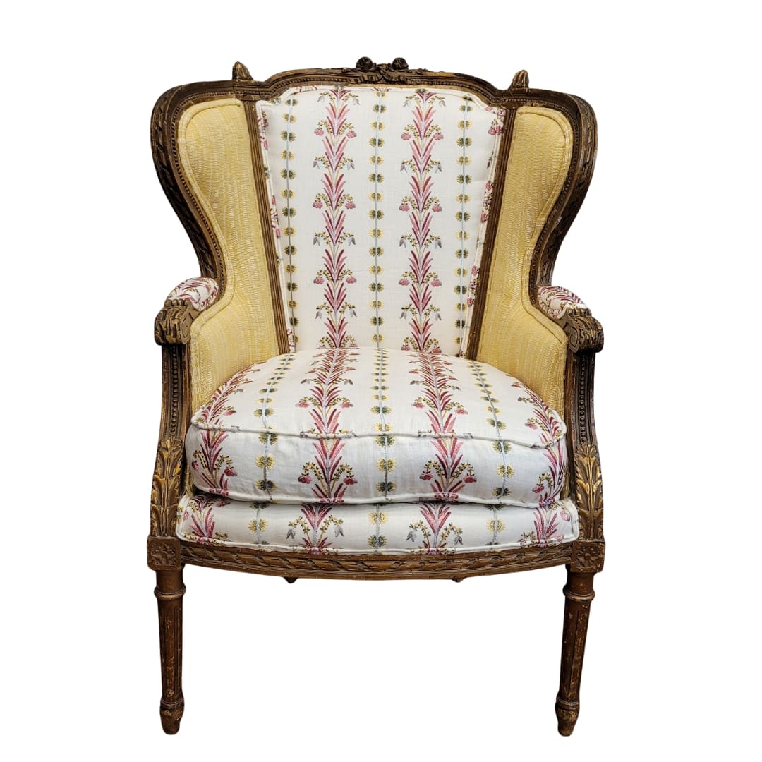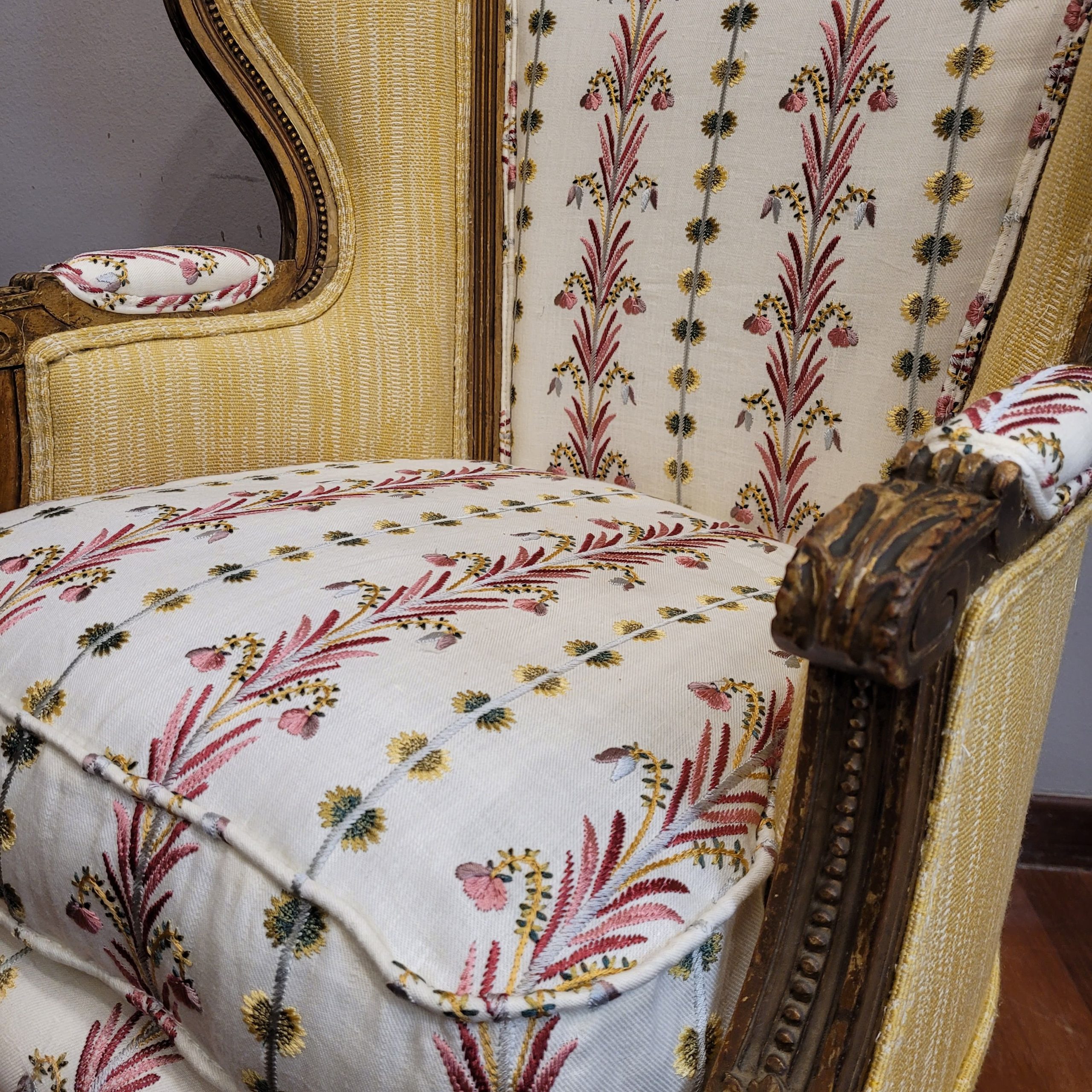 Asiento, respaldo y apoyabrazos recién tapizados en un original conjunto de dos telas de la prestigiosa y reconocida marca Pierre Fray, maison fundada en 1935 en París por el diseñador homónimo. La Maison Pierre Frey ofrece ahora papeles pintados y revestimientos murales, alfombras y artículos de decoración y mobiliario, además de telas para decoración de interiores. Los laterales del respaldo en un falso liso de color amarillo poco saturado y, como protagonista, una exquisita tela de fondo crudo y bordados florales. El colorido del tapizado aporta un toque moderno y a la vez elegante que equilibra el aire clásico de la estructura.