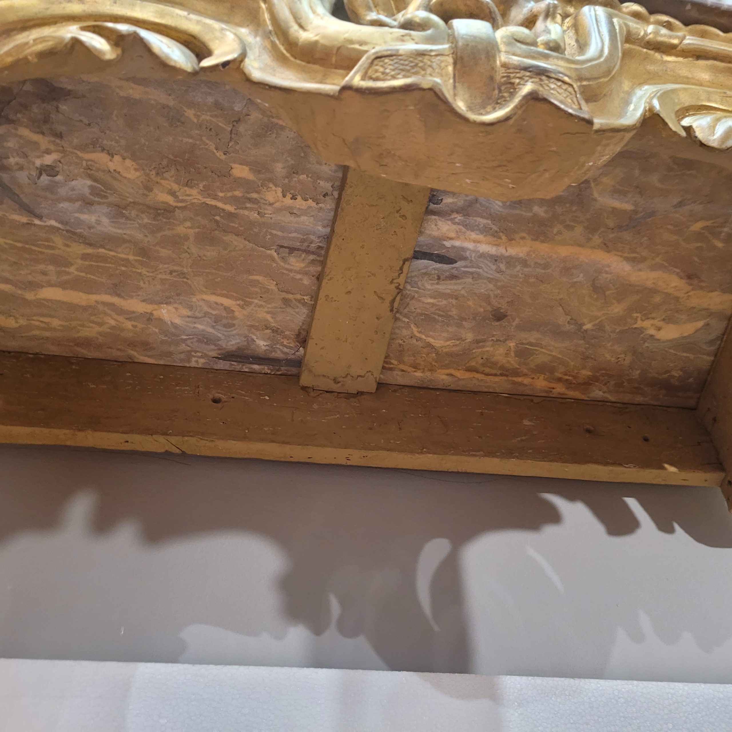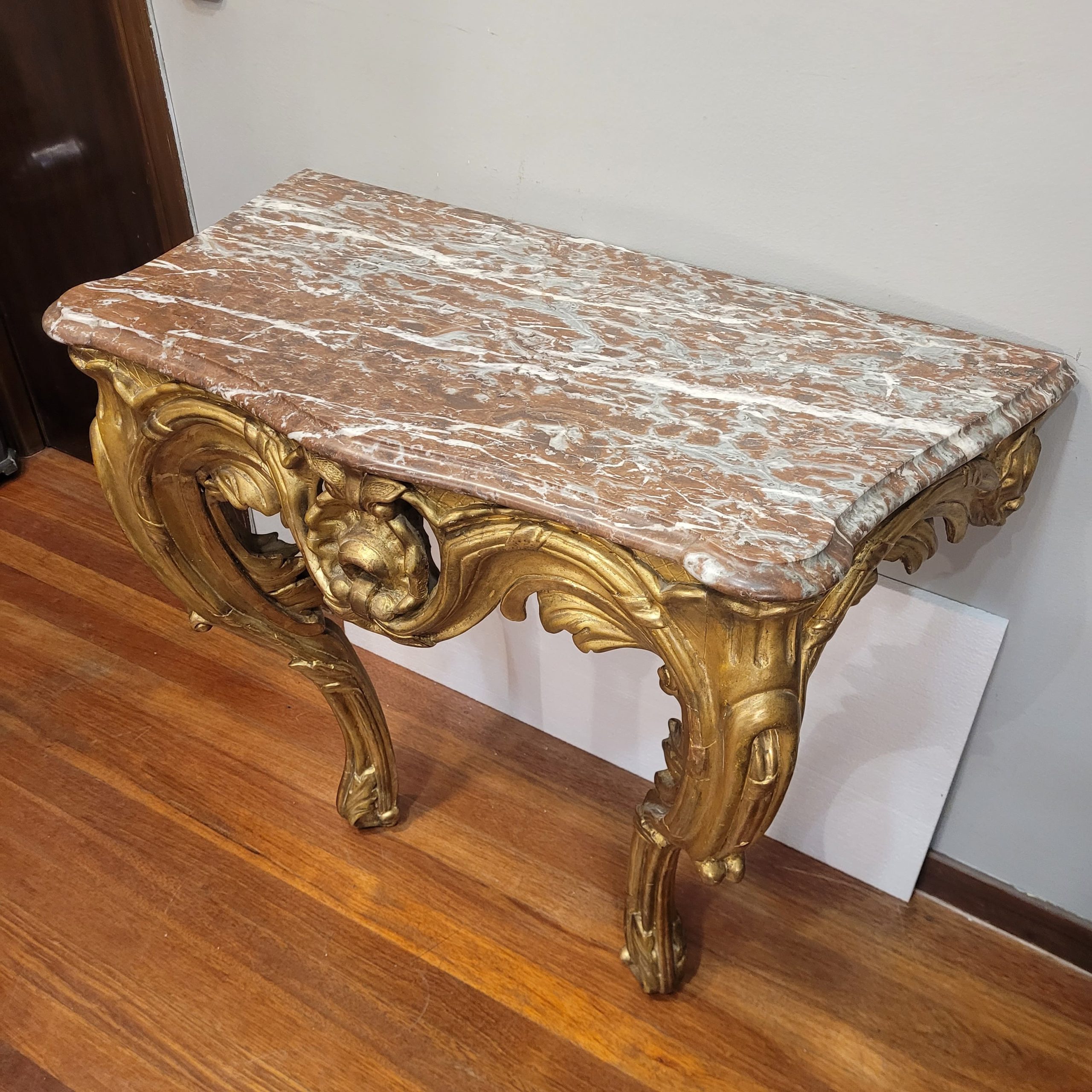 Extraordinaria consola de apoyo barroca o Luis XV francesa en madera tallada y dorada con oro fino, realizada en el siglo XVIII. Presenta una voluptuosa y ligera estructura, enfatizada por sus extraordinarias patas cabriolé, el faldón con una gran venera central, y el sobre de mármol. Cuenta únicamente con las dos patas delanteras, pues la parte trasera debe anclarse a la pared.