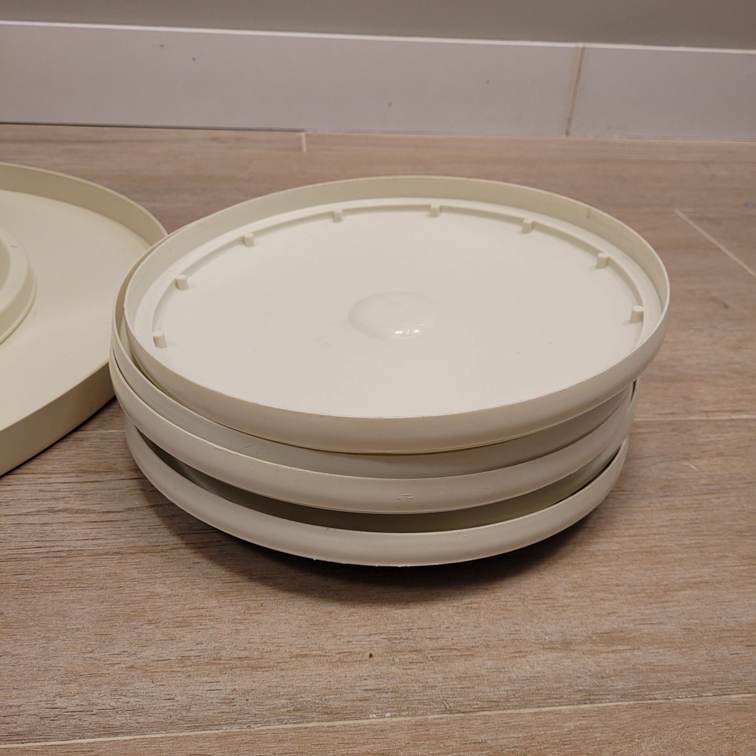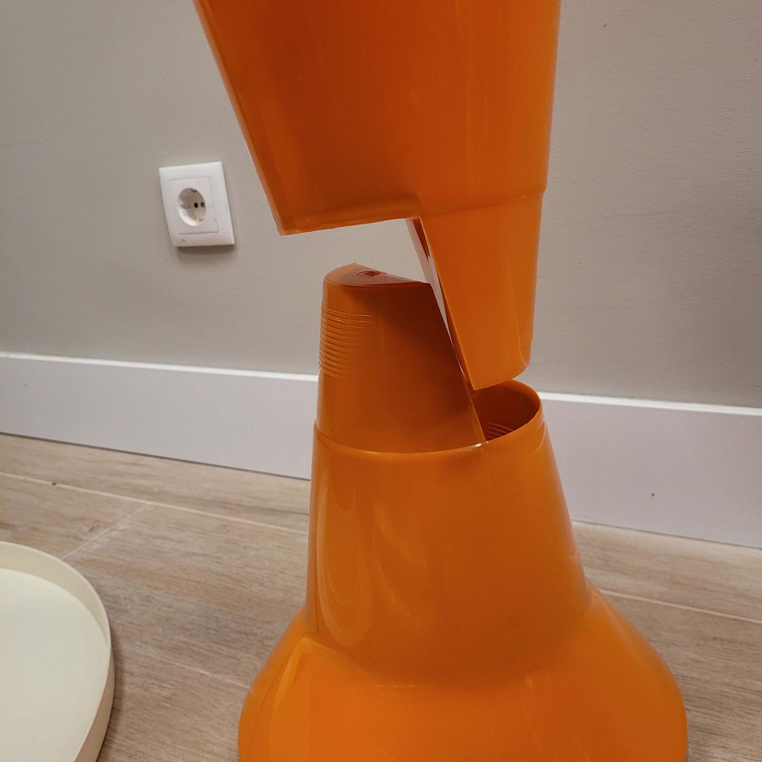 Divertido conjunto de mesa y cinco taburetes en polipropileno, estilo Space Age, producido por la marca italiana Gianplast en la década de 1970, siguiendo el icónico modelo Tam Tam Diábolo del diseñador francés Henry Massonnet. El taburete Tam Tam fue diseñado en 1968 por Henry Massonnet, y pronto se convirtió en un imprescindible del mobiliario del siglo XX. En sus orígenes, fue ideado como asiento fácilmente desmontable para los aficionados a la pesca. Su cuidado diseño en forma de reloj de arena y su gran ligereza, así como sus colores llamativos, fueron las principales razones de su éxito. Logró tal éxito que fue expuesto en el MoMA.